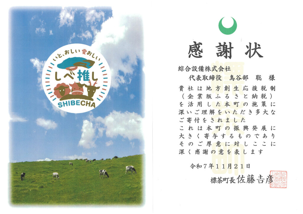 標茶町へ地域再生計画に基づき実施される事業に対し企業版ふるさと納税の寄付を致しました。