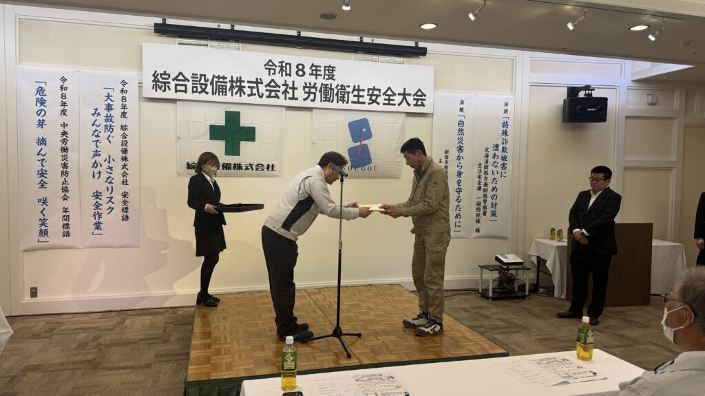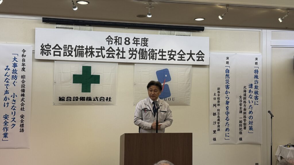 令和8年度4月労働衛生安全大会を実施しました。 2026.04.22 イベント > お知らせ 労働災害及び交通災害の絶滅を目指して安全大会を開催しました。 「特殊詐欺被害に遭わないための対策」につてい釧路方面釧路警察署 生活安全課 一般防犯係 様に講和をいただき、「自然災害から身を守るために」を釧路市総務部 防災危機管理課 様から講和をいただき、安全作業・健康について再確認する機会となりました。
